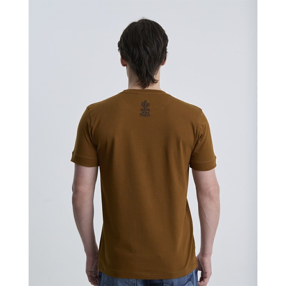 Remera estampada de algodón elastizado, escote redondo de calce slim fit y manga corta con puños anchos. Composición 94% algodón, 6% elastano.