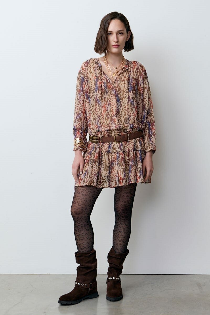 Confeccionado en tejido liviano, semitransparente e hilado de lurex. Una tela con caída fluida, ideal para sumar un aire folk a tu look.